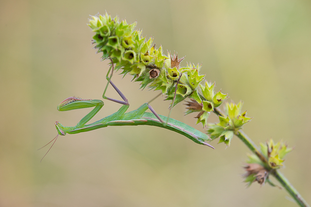 Die Europäische Gottesanbeterin (Mantis religiosa) ist die einzige heimische Gottesanbeterinnenart und trotz ihrer Körpergröße von bis zu 7,5cm ein echter Tarnungskünstler. Die Lauerjäger verharren minutenlang regungslos im Gras und warten auf Beute.