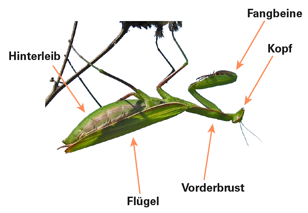 Bei der Gottesanbeterin handelt es sich um eine leicht zu erkennende Art, die sich zum einen durch ihre Größe, aber auch durch ihre zu Fangbeinen umgebildeten Vorderbeine von allen anderen heimischen Arten unterscheidet. Auf den folgenden Bildern sind die charkteristischten Merkmale markiert und beschriftet. Es sei noch angemerkt, dass die Grundfarbe der Tiere variieren kann. Von einem satten grün bis zu einem beige können alle Farbvarianten auftreten.